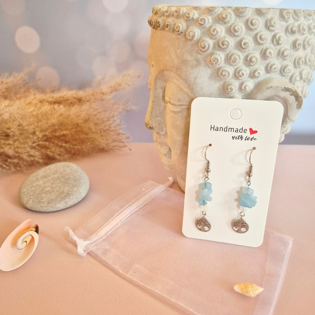 Boucles d’oreilles BORA BORA – Aigue-Marine naturelles & Arbre de Vie