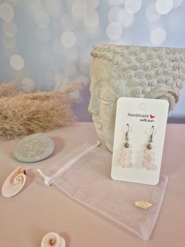 Les boucles CŒUR NOMADE apportent douceur et bonne humeur grâce à l’alliance du Quartz Rose naturel du Brésil et d’un petit smiley argenté plein de joie.