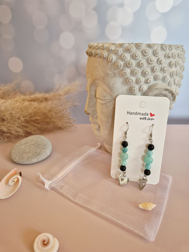 Boucles d’oreilles MAYA – Amazonite du Pérou, Obsidienne du Mexique & Cœur
