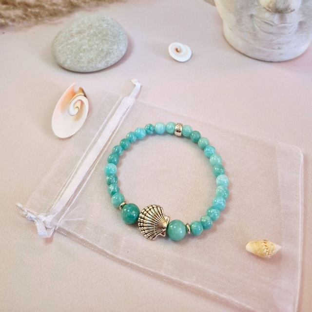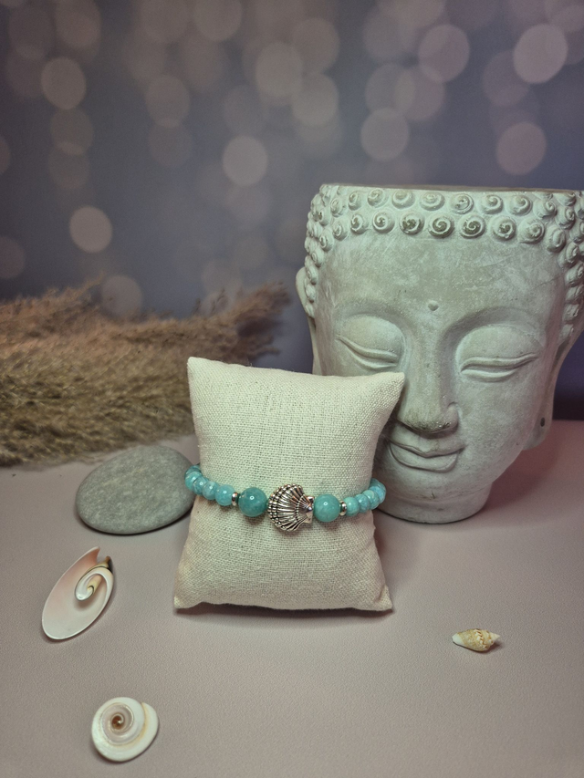 Composé de perles d’Amazonite qualité AA en 6 mm, il présente au centre un coquillage métal argenté, encadré de deux perles d’Amazonite 8 mm, pour une touche estivale et délicate.
