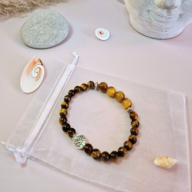 Composé de perles de qualité A, Œil de tigre naturel (6 mm) et Œil de tigre doré (8 mm) au centre, il est sublimé par un Arbre de Vie argenté, symbole d’ancrage et d’énergie positive.