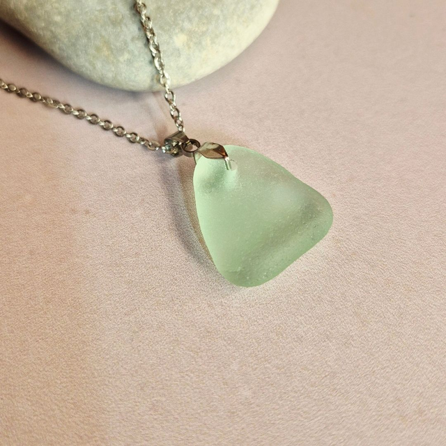 Ce verre de mer vert d’eau, presque translucide, est une pièce rare par sa taille et sa douceur lumineuse. Autrefois simple éclat, il a été poli naturellement par la mer, le sel et le temps, devenant un trésor apaisant aux reflets délicats.