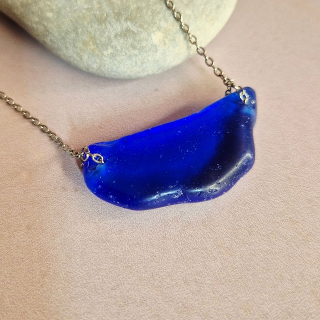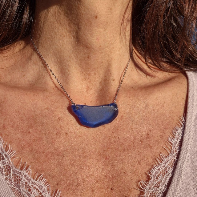 Ce collier est réalisé à partir d’un verre de mer bleu nuit, ramassé à la main sur la plage de mon enfance, à Ardore Marina, en Calabre (Italie).