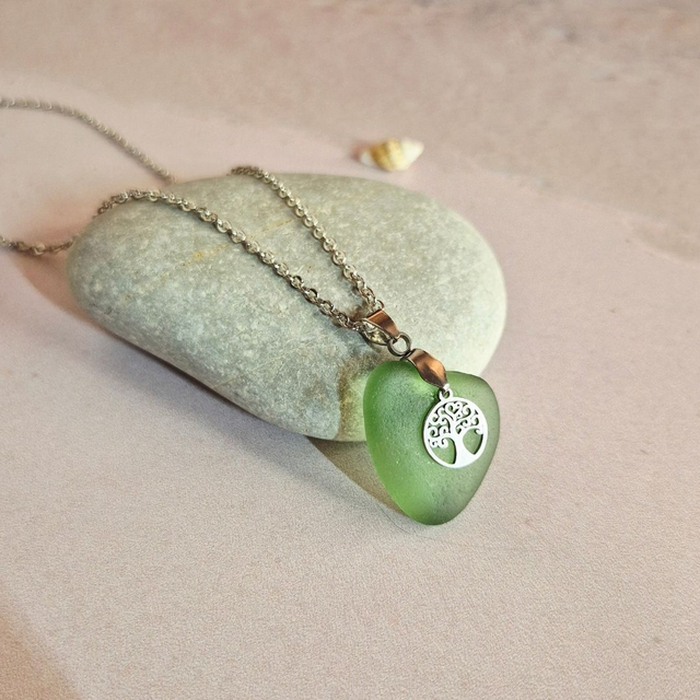 Sur ce collier, l’Arbre de Vie symbolise l’ancrage, la force et l’harmonie entre la Terre et la Mer, en écho au voyage de ce caillou façonné par le temps.